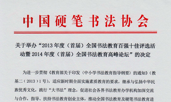 为进一步贯彻《教育部关于印发〈中小学书法教育指导纲要〉的通知》(教基二﹝2013﹞1号),适应新时期全面实施素质教育的要求,继承与弘扬中华民族优秀文化,践行“大书法”理念,促进社会各界书法教育办学机构加深交流与合作,指导、扶持书法教育创业主体,推动全国书法教育及硬笔书法教育进一步健康持续发展,中国硬笔书法协会特决定于2014年8月4日-10月7日举办“2013年度(首届)全国书法教育百强十佳”(以下简称百强十佳)评选活动,于10月9-12日在京举办“2013年度(首届)全国书法教育百强十佳评选颁奖典礼暨2014年度(首届)全国书法教育高峰论坛(以下简称高峰论坛)”。现将有关事项通知如下: