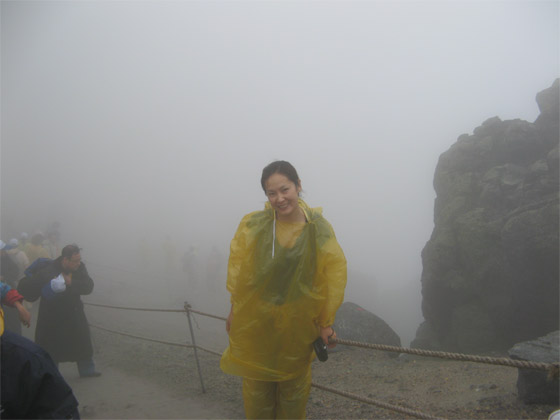 从车上下来后,冰凉劲吹的山风加上厚重的雾气,立刻让我们寒颤不止,估计这时的气温大约在3―4度左右。我们很多人都是短袖的衣服,虽然下车的地方有出租棉衣的,30元一件,而且也要排很长的队,所以我们只好穿上雨衣暂且避寒了。长白山是一座休眠火山,所有的土都是粒状的细砂,陡坡上全是火山灰,没有台阶,也没有固定的山路, 只有沿着火山灰向上攀登,所以前面一座七十五度的陡坡,虽然只有百米来长,但由于风很大,海拔很高,凉气很重,登上去也实在不易。有身体不太好的,已经出现嘴唇发紫,呼吸有点困难的状况,不过好像没有人半路放弃的,停一停,手脚并用,又继续爬了。走走停停,大概20分钟左右才爬到山顶,可是雾依然很大,什么也看不到,四五米远的范围之内能勉强的看到一群群模糊的人影,旁边的火山岩石形状各异,大大小小。雾太大,谁也看不清下面到底有多深,到底什么样,体会不到一览众山小的感觉,但上面火山喷发后熔岩还是会让人感到天池的雄奇,而且由于雾气很大,周边比较危险,因此也更显天池的威严与壮美。天池就在下面,可却什么也看不到,那种着急和失望让人想抓狂。天池盛的是圣水,就连天上的玉皇和王母也这么吝啬,十日天池九不开,轻易不把真面目示人,看来果真不假。虽然风很大,冻得直哆嗦,但为了不枉此行,大家一直坚持着,就想等着老天爷开天呢。旁边的几个韩国老人,估计也能有70多岁,比我们还早到,看得出来很激动,一直不停的说着,比划着。可能这也是他们最后一次登天池了,看不到天池的真面目,不知道算不算是终生遗憾了,所以也和我们一样在等,在坚持。