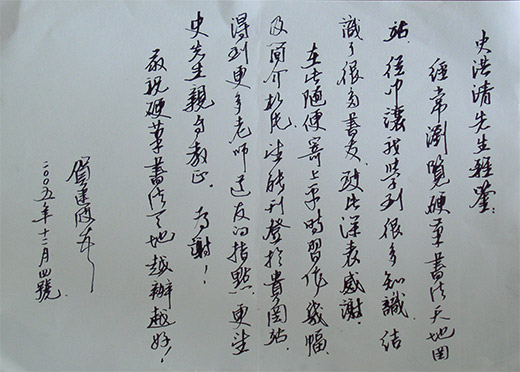 广东·贺建波先生给《硬笔书法天地》网站站长史洪清的亲笔信