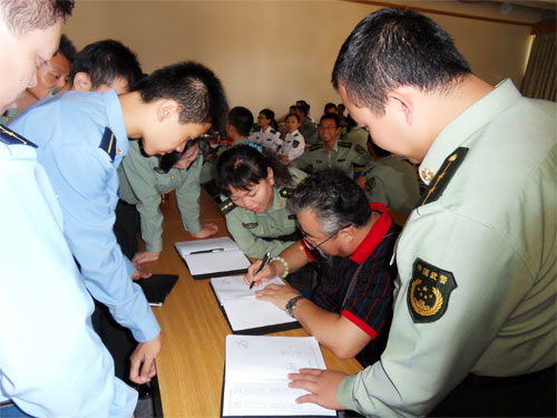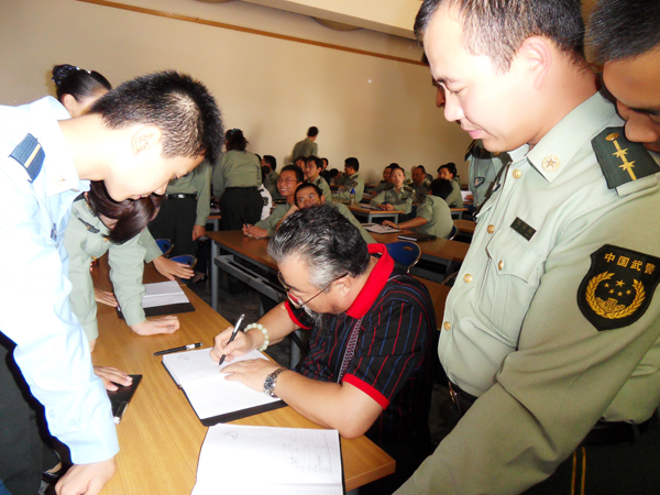 应解放军官兵学员强烈要求,闫锐敏在课间为学员们签名留念