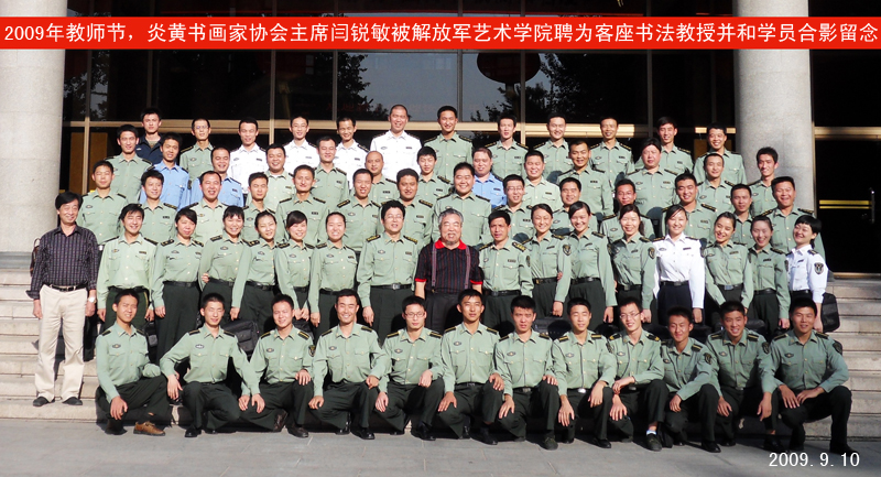 2009年教师节,炎黄书画家协会主席闫锐敏被解放军艺术学院聘为客座书法教授并和学员合影留念