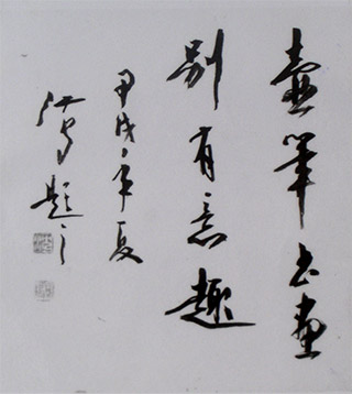 沈先生的书风和在书坛活跃的身影我仰慕久矣。如问对其书法有何评价?答曰:字如其人。请看,那严谨、精准的结体与章法,恰似他完美的人格支撑;潇洒、雅逸的书风,蕴含着过人的智慧和才华;柔畅、清爽而富有节律的线条,折射出温和谦让的光环;那“壶笔书画别有意趣”、“笔下龙蛇走”壶笔力作不正是他那饱经风霜的铮铮铁骨嘛!