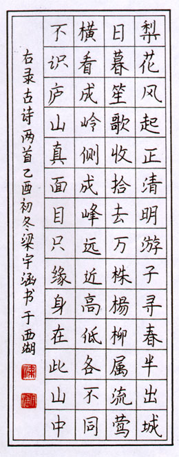 梁宇涵 9周岁,现就读于杭州长寿桥小学长青校区三年级。一年级开始学习硬笔书法,同时兼学钢笔素描。学习刻苦认真,兴趣特浓,悟性好,进步快,在培训班中名列前茅,是个很有发展潜力的学员。