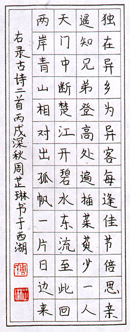 9周岁,现就读于杭州长寿桥小学三塘校区三年级。幼儿大班开始学习硬笔书法,喜欢弹琴,学习认真、刻苦,坚持不懈。有决心更上一层楼。