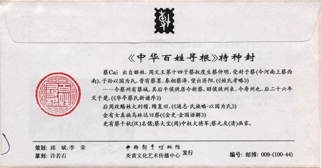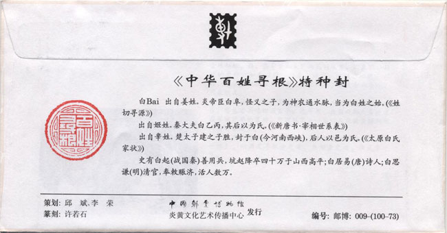《中华百姓寻根》特种封1996年由中国邮票博物馆等单位发行,共100枚,每枚一姓(订购前请查附件“姓氏100家”,名单上没有的无法订制),带仿伪标志,封上加盖专为各姓氏篆刻的印章,封背印有姓氏起源,另配中国邮票博物馆发行的专题明信片,详细说明姓氏起源、演变和发展过程。销1996年4月4日黄帝陵日戳(黄帝是中国华夏族公认的全族始祖,4月4日是华夏人纪念祖先的节日,为纪念华夏共同的祖先,特在封上销此日戳),以志永志不忘,同时满足寻根者之需、集邮者之趣、收藏者之乐。是不可多得的艺术珍品。