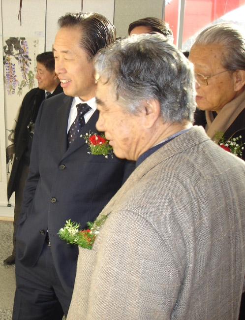 张华庆和大连市金州区区长才力在展览现场交谈