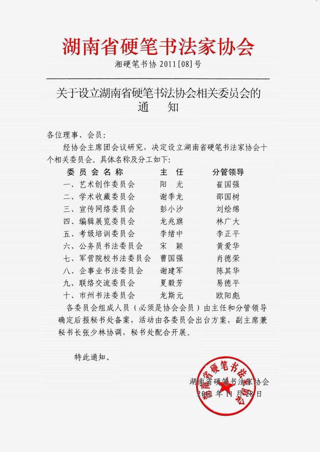 湖南省硬笔书法家协会艺术创作委员会委员条件细则 凡本协会会员(暂未入会者可申请入会),在创作上有较高水平,具备下列条件之一者可向协会艺术创作委员会申请担任委员,经审核同意后由协会公布: (1)在中国硬笔书法协会主办的“全国书法展”(含“全国中青展”、“百强提名展”)入展二次或获奖一次以上者。 (2)在中国书法家协会举办的书法展赛中入展二次或获奖一次以上者。 (3)在中国硬笔书法协会主办的全国各“单项展”、“冠名展”入展三次或获奖二次以上者。