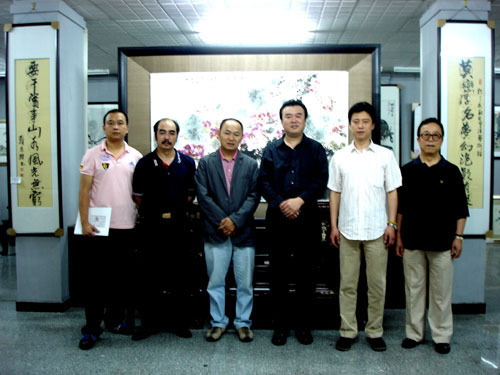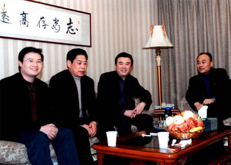 张华庆与上海空军某部王讯谟副司令、天艺书画院戴闪庆书记、中共上海市委宣传部江鹏亲切交谈