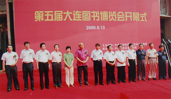 第五届大连图书博览会8月13日隆重开幕。大连市委、市政府、市人大、市政协领导与中国硬笔书协主席庞中华(左四)、新加坡狮城书法篆刻会主席丘程光(左六)、辽宁省硬笔书法家协会主席张华庆(左三)出席开幕式。