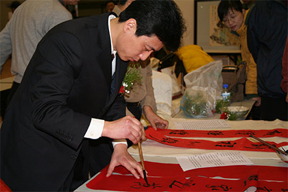 “红墨水”书画篆刻组合的作者是李冰、王咸俊、栾传益、于清华、宋炳坤、王国昶、何雨春、李殿高、刘颖、丁立民、卢杰、刘发林、李继东、阎海波、李涛、朱萸。著名书法家杨仁恺、宋慧莹、伦杰贤、魏哲、张华庆、祁毓麟、王丹、王宏、张子明、张世刚、朱成国、何连仁、熊洁英、李善荣等题词祝贺。本次展览还邀请了“蓝墨水”书法组合彭过春等十二位书法家友情参展。这次展览共展出书法、国画、篆刻、硬笔书法作品200余幅。这些作品是参展作者艺术创作的结晶,书画家们努力以先进文化的特殊作用为和谐社会的建设做出积极贡献。展览期间书画家们免费为广大市民书写春联,将传统的书画艺术送入千家万户,丰富和活跃广大市民的节日文化生活。 |