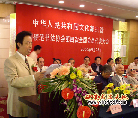 庞中华作中国硬笔书法协会工作报告 (史洪清 摄)