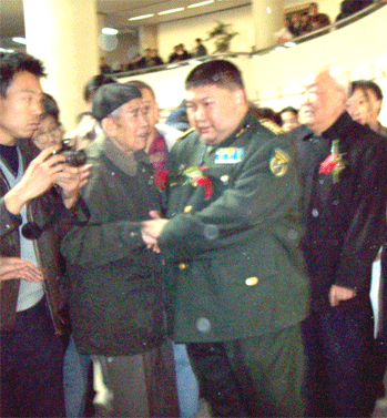 图为毛泽东孙子毛新宇将军在参展时碰到毛泽东机要秘书高智时,紧握高的双手,激动得热泪盈眶。