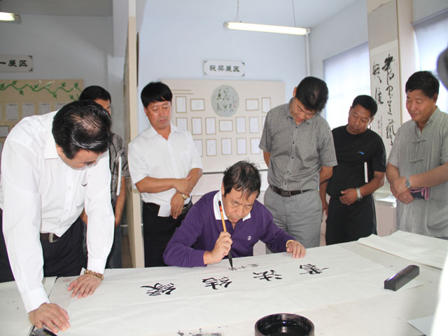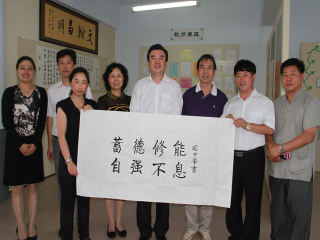 仪式后,庞中华老师及中国硬笔书法协会领导实地参观了阿荣旗一中书法走廊及书法展厅。庞中华先生即兴为阿荣旗一中新校区书写了校训“蓄德修能自强不息”及“书法结缘”的题词。
