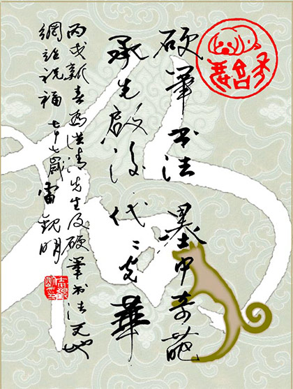 洪清站长: 丙戌新春将至,送上自制的“狗年贺帖”,以表对你和网站的节日祝贺。收到后望回复。 我每年都自做“生肖年帖”馈赠友人。这幅年贴仍保持以往以文字创意的风格。右下的古代“犬”(“狗”字是唐以后才有的)字,源自《六书经蕴》,在基本保持其原有文字的形态时,作了一些艺术处理。帖上圆形章为金鼎文“(狗)年吉庆”。题词用硬笔书写。