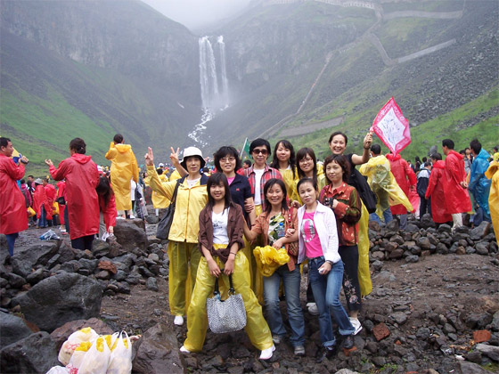 我们的第一站是长白瀑布。穿过荫蔚葱葱的山间木板小路,空气清新凉爽,偶尔有点淅沥的小雨,此时非但不会影响兴致,反而是增添了另一种新奇的感觉;各色各样的雨衣、各色各样的装束形成了另一道特别的风景。几经曲折,来到瀑布脚下。长白瀑布位于白头山天池池北,天池水由此流泻而下,由于山大坡陡,水势湍急,一眼望去,的确象一架斜立的天梯,故此得名"通天河",也叫"乘槎河"。此河流到1250米处便形成落差为68米的瀑布,因系长白山名胜佳景,故名长白瀑布。由于落差大,在两条雪龙似的水柱猛烈冲击下,溅起浪花无数,飞雪漫天,千年之后,瀑下形成20多米深的水潭。湍急的流水柱入二道白河——即为松花江的正源。长白瀑布是我国东北最大的瀑布!(至此,思及当年观看后久久难以平静的蒲石河瀑布,其落差、其宽度、其气势、其壮观程度,这次是着实让我彭湃了一把。)