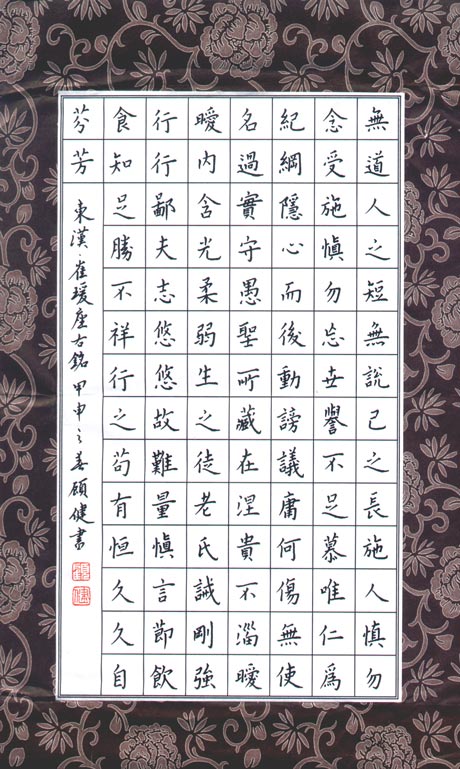 作品编号: Y541 原作尺寸: 26.7 cm × 16 cm 说 明:全新,复印纸书写,花纹纸简单装裱。因邮寄有折痕。本图片仅供参考,以实物为准。 起 拍 价: 20元