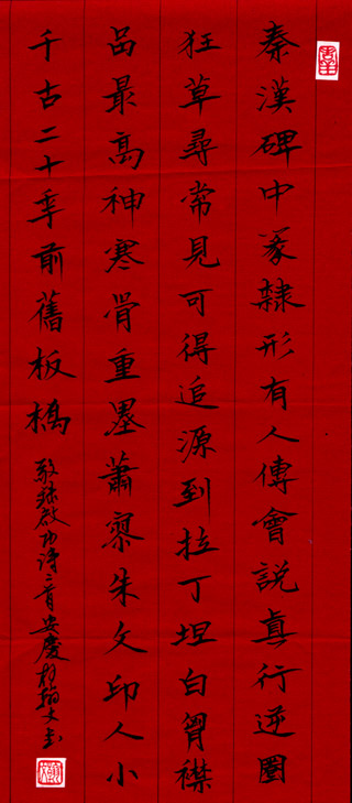 作品编号: 362 原作尺寸: 33 cm × 12.8 cm 说 明:全新,大红纸书写,无装裱,有折痕。 起 拍 价: 20元(作者自定)