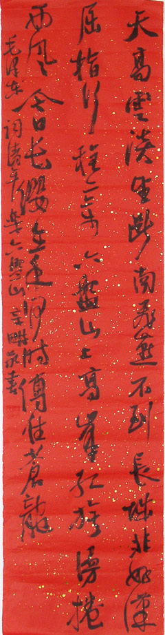 作品编号: M442 原作尺寸: 132 cm × 33 cm 说 明:全新,红洒金宣纸书写,无装裱。因邮寄有折痕。本图片仅供参考,以实物为准。 起 拍 价:80元(作者自定)