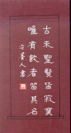 作品编号: Y243 原作尺寸: 14.9 cm × 8 cm 说 明:全新,褐色卡纸、银色珠笔书写,无装裱。 起 拍 价: 10元