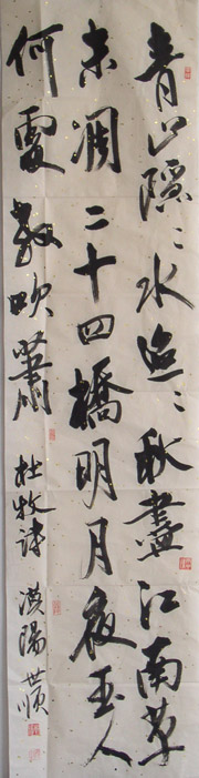 作品编号: M846 原作尺寸: 132 cm × 33 cm 说 明:全新,洒金宣纸书写,无装裱,有折痕。本图片仅供参考,以实物为准。 起 拍 价: 60元